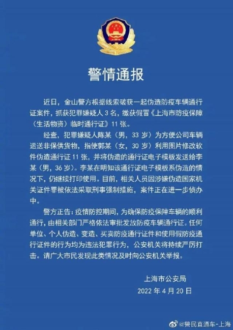上海金山警方于近日破獲一起偽造防疫車輛通行證案件