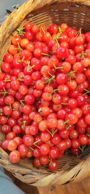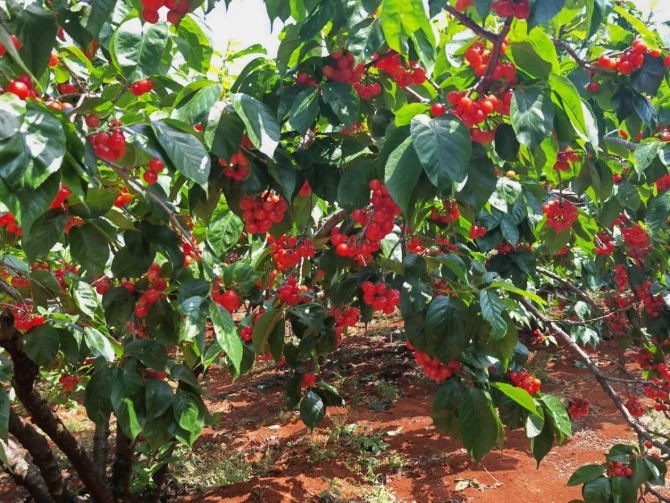 從赤鷲鎮(zhèn)咀咪哩村的大路一直順著走,路兩側(cè)種滿了櫻桃樹。赤鷲鎮(zhèn)千畝櫻桃掛滿樹枝,色澤剔透,飽滿紅潤(rùn),樹枝被肥沃的土地滋潤(rùn)著,將長(zhǎng)長(zhǎng)的樹枝伸出了圍欄,一伸手就可以摘下嘗鮮。赤鷲的櫻桃光是聞起來(lái)鼻腔中就充滿了淡淡的果香,摸起來(lái)光滑、有彈性,像裹著一層薄皮的果凍,摘一顆,放進(jìn)嘴里,鮮到心里。這里的櫻桃不屬于純甜的,口感帶點(diǎn)酸味。
