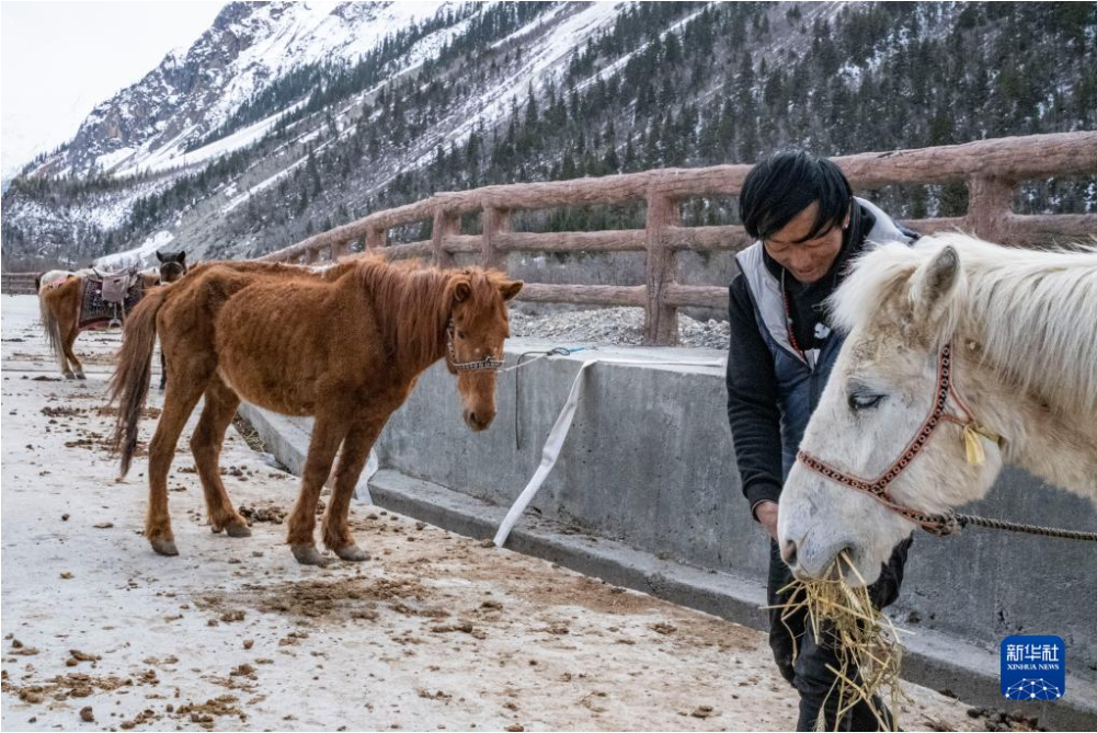村民在林芝市波密縣境內(nèi)的米堆冰川腳下喂馬(4月23日攝)。新華社記者 孫非 攝