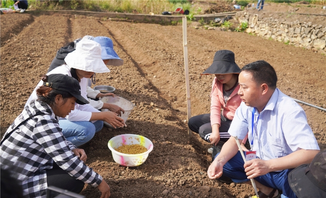 一大早,農(nóng)技人員來到蠻英村試種田里,與種植戶一起勞作,幫忙理溝、施肥,現(xiàn)場教授種植方法。