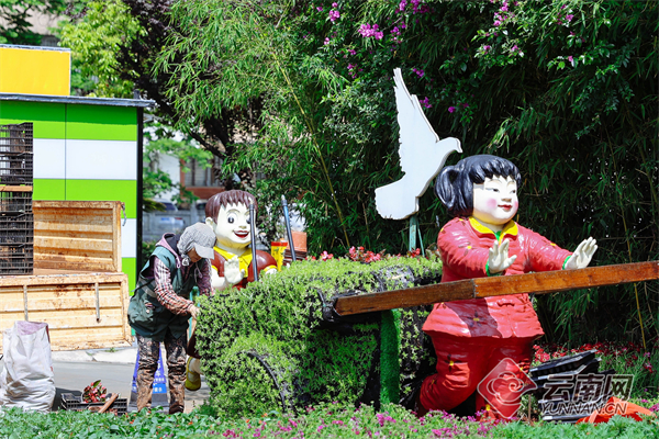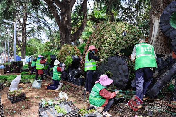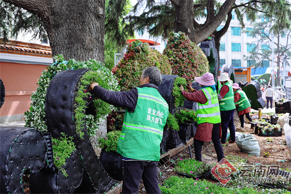 在北京路與青年路交匯處的立體景觀內(nèi),數(shù)名綠化工作人員正忙著撤下冬季綠植,更換上夏季花卉。一串紅、海棠、孔雀草、萬壽菊、天竺葵、綠絨蒿、五色草、景天、矮牽牛、鳳仙、美女櫻、大花海棠、鼠尾草……數(shù)十種色葉與花卉交織搭配,群花圍翠,不僅順應(yīng)了季節(jié)變化,還呈現(xiàn)出全新的藝術(shù)效果,緩解人們審美疲勞,體現(xiàn)了鮮明的春城特色。