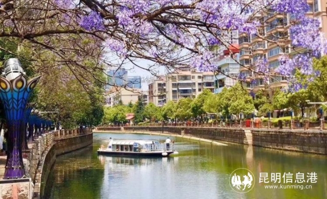 春夏之季,岸柳成行,花團錦簇,昆明是夢幻的藍紫色。在這一幕幕夢幻色彩里最有特色的要數(shù)盤龍江邊,盤龍江橫貫整個昆明壩子,千百年來流淌不息,孕育了異彩紛呈、內(nèi)涵豐富的盤龍江文化。尤其行走在桃源街至江濱西路這段環(huán)線,沿河是望不盡的風(fēng)景,“四月間,五月天”江邊種植的排排藍花楹肆意綻放著,串串花簇壓彎了樹枝,垂至江邊人行棧道形成一道特色的“夢幻”花路,一簇簇藍紫色的花隨風(fēng)飄搖,讓市民為之向往。
