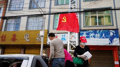 與此同時(shí),街道上,許多志愿者紛紛從插有黨旗的小貨車(chē)上下來(lái),各自拿上分配好的醫(yī)療物資,朝居家隔離健康監(jiān)測(cè)的群眾家走去。
