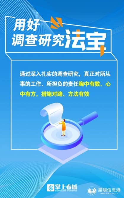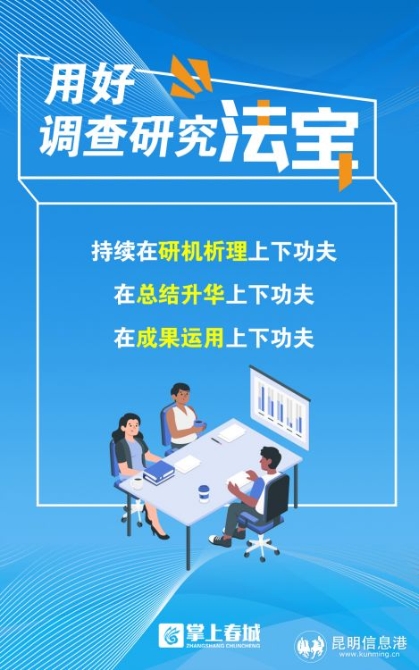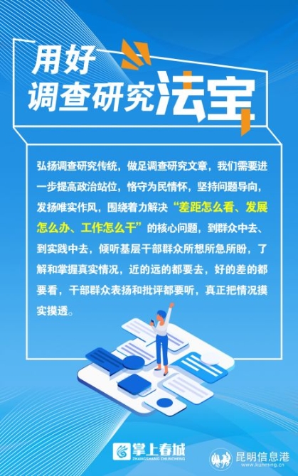當(dāng)前,全市上下正深入開(kāi)展“當(dāng)好排頭兵”大討論大競(jìng)賽活動(dòng),昆明的經(jīng)濟(jì)社會(huì)建設(shè)發(fā)展處于頂壓前行、爬坡過(guò)坎的關(guān)鍵時(shí)期。大興調(diào)查研究之風(fēng),是我們提振信心、創(chuàng)新舉措、比學(xué)趕超、爭(zhēng)先創(chuàng)優(yōu),加快形成推動(dòng)高質(zhì)量發(fā)展火熱局面的重要保障。就此,昆明產(chǎn)業(yè)發(fā)展暨招商引資、項(xiàng)目建設(shè)工作會(huì)議號(hào)召全市各級(jí)黨員干部,“要把調(diào)查研究的文章做足,多到工廠車間、項(xiàng)目工地、田間地頭開(kāi)展調(diào)查研究,把了解事情來(lái)龍去脈的工作做足,把權(quán)衡利弊的工作做足,堅(jiān)持在全面、客觀、歷史、辯證分析的基礎(chǔ)上作決策,決不能打無(wú)把握之戰(zhàn)”。全市各級(jí)各部門(mén)和廣大黨員干部,應(yīng)當(dāng)圍繞市委要求部署,主動(dòng)拿起調(diào)查研究這一法寶,結(jié)合“當(dāng)好排頭兵”大討論大競(jìng)賽活動(dòng),沉下去了解民情、掌握實(shí)情,不斷練就查找問(wèn)題的“火眼金睛”,拿出破解難題的“七十二變”,踏遍攻堅(jiān)克難的萬(wàn)水千山,取得跨越發(fā)展的“如意真經(jīng)”!