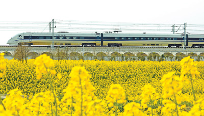 江蘇省鹽城市,和諧號列車在鹽通鐵路上馳騁。
