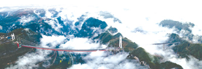 湖南省湘西土家族苗族自治州吉首市,矮寨特大懸索橋周邊云霧繚繞,美不勝收。