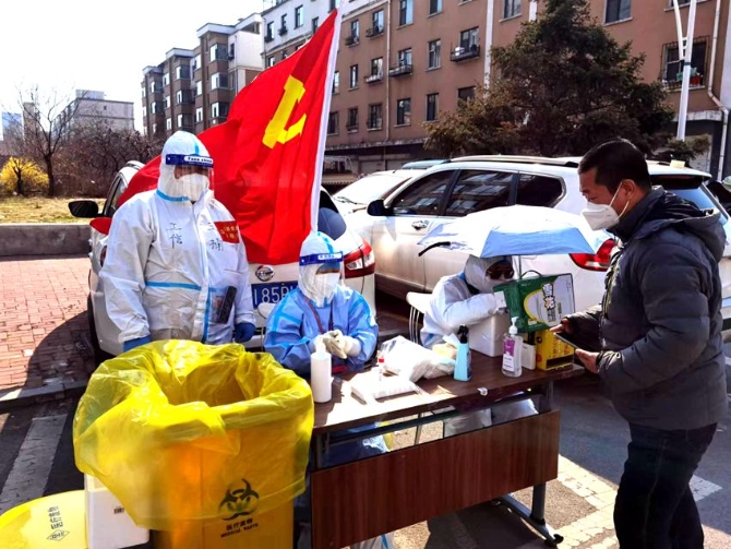 小區(qū)臨時(shí)黨支部黨員參與全員核酸檢測采樣工作。(長春市委組織部供圖)