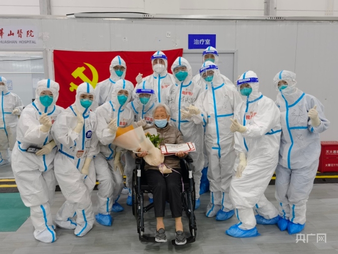 央廣網(wǎng)上海5月6日消息(記者楊靜 林馥榆)5月4日,一段9分鐘的視頻在微信群和朋友圈廣泛傳開。93歲的王漫如老人從上海臨港方艙醫(yī)院康復(fù)出院,華山醫(yī)院的醫(yī)護(hù)們?yōu)樗e行了莊重又溫暖的慶祝儀式。王漫如老人曾作為抗美援朝志愿軍隨隊(duì)護(hù)士,在朝鮮戰(zhàn)場上榮立三等功。在臨港方艙經(jīng)過為期一周的治療和觀察后核酸檢測結(jié)果“轉(zhuǎn)陰”。4月30日,王漫如老人順利出艙。
