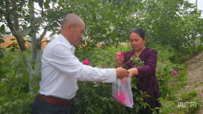 吾吉麥麥提·玉蓀正和妻子采摘新鮮的玫瑰花冠(央廣網(wǎng)發(fā) 趙飛 攝)