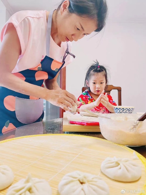 劉虹在家與女兒一起包包子(圖片來自劉虹微博)