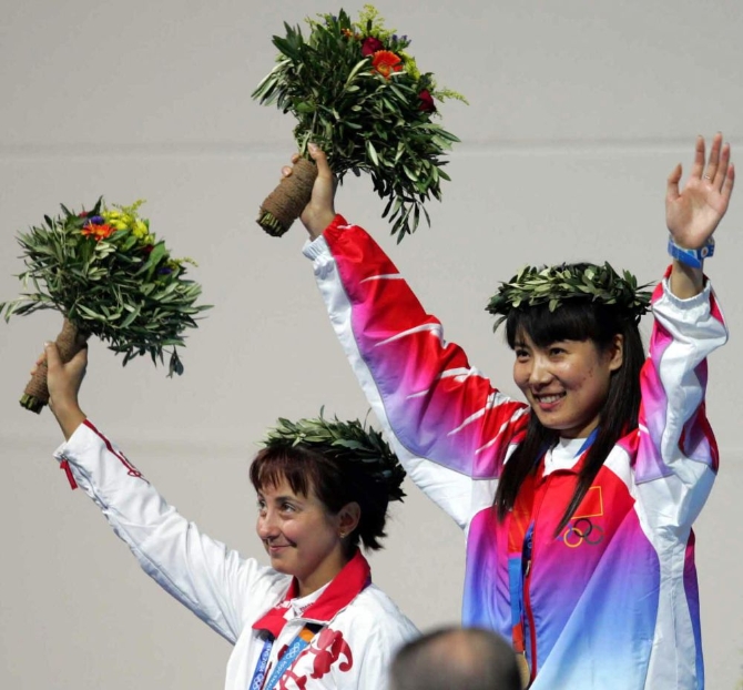 2004年8月14日,中國選手杜麗(右)奪得雅典奧運會射擊女子10米氣步槍金牌。