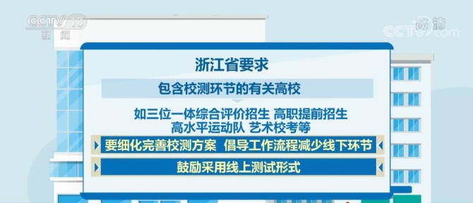 浙江省要求各地各校提前制定突發(fā)疫情應(yīng)急預(yù)案,做到“一類(lèi)一方案”“一生一方案”。按要求為每個(gè)考點(diǎn)配備防疫副主考,設(shè)置具備防護(hù)隔離措施的特殊通道和專(zhuān)用隔離考場(chǎng)。包含校測(cè)環(huán)節(jié)的有關(guān)高校,如三位一體綜合評(píng)價(jià)招生、高職提前招生、高水平運(yùn)動(dòng)隊(duì)、藝術(shù)校考等,要細(xì)化完善校測(cè)方案,倡導(dǎo)工作流程減少線下環(huán)節(jié),鼓勵(lì)采用線上測(cè)試形式。