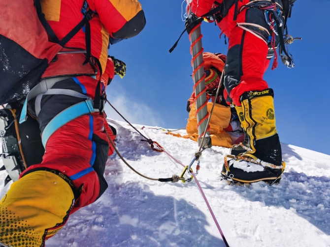 5月4日,在珠穆朗瑪峰峰頂,科考隊員在采集冰雪樣品。新華社特約記者 索朗多吉 攝