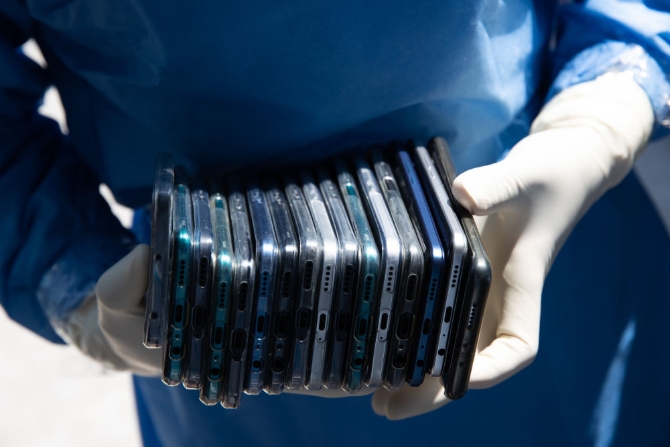 5月4日,在上海浦東北蔡鎮(zhèn)設(shè)立的醫(yī)護(hù)集散點(diǎn),參加核酸采樣的志愿者領(lǐng)取用于掃碼登記的手機(jī)。新華社記者金立旺攝