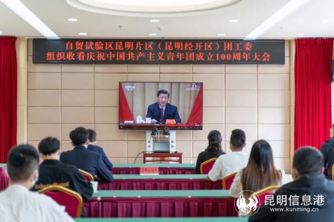昆明信息港訊 記者張龍英 5月10日上午,慶祝中國共產(chǎn)主義青年團成立100周年大會在北京人民大會堂隆重舉行,中國(云南)自由貿(mào)易試驗區(qū)昆明片區(qū)(昆明經(jīng)開區(qū))集中組織收看慶祝大會。