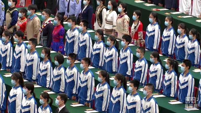 大會(huì)開(kāi)始后,全體起立,高唱國(guó)歌。(總臺(tái)央視記者 黃京輝拍攝)