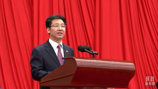 共青團(tuán)中央書(shū)記處第一書(shū)記賀軍科在大會(huì)上發(fā)言。(總臺(tái)央視記者 張曉鵬拍攝)