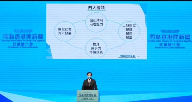 4月29日,李家超公布競(jìng)選政綱。新華社記者 呂小煒 攝