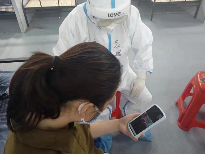 5月1日,重慶市援滬醫(yī)療隊(duì)醫(yī)護(hù)人員與新入方艙的患者溝通身體情況