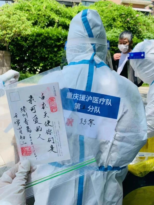5月2日,采樣分隊(duì)彭軍在松江區(qū)九亭鎮(zhèn)綠洲香島小區(qū)進(jìn)行核酸采樣,一名小女孩主動(dòng)送來(lái)明信片,背面有手寫(xiě)的“白衣天使你們是最可愛(ài)的人”。(本文視頻、圖片均由重慶市援滬醫(yī)療隊(duì)提供)