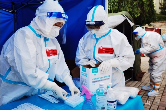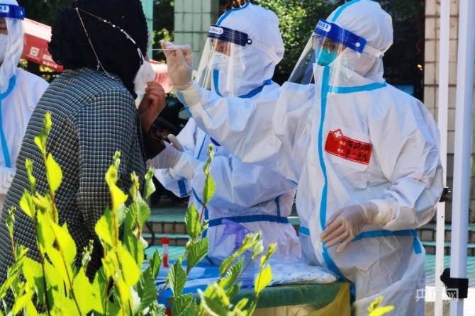 “采集點的醫(yī)護人員從清晨一直到下午,由于全身穿著防護服,一穿就是一天,將近七八小時不能喝水、不能進食也不能上廁所,一天忙下來身上已經(jīng)完全濕透,工作完成的時候,已經(jīng)忘記了饑餓,只想找個地方躺下來?;氐剿奚岷唵蔚爻渣c飯,就睡下來,第二天從新開始。這已經(jīng)是她們連續(xù)工作了28天,上次疫情中我們就在現(xiàn)場,剛結(jié)束,沒想到新一輪疫情又來了,沒有機會休整,我們直接來到了這里?!北褰嬖V記者。