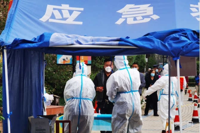 對于她來說這已經(jīng)再熟練不過了,剛剛在上一輪的疫情中她參加了城中區(qū)核酸檢測工作?!按蠹掖┖梅雷o服后再仔細檢查一下,別忘了,在胸前和背后都寫上醫(yī)院的名字,”她一邊忙著幫隊友整理防護面罩,一邊提醒身邊的同伴。很快全副武裝的小伙伴們各自來到自己的崗位,再次確認所有的準備工作和所有的工作流程已完成。與現(xiàn)場志愿者的交流后,引導(dǎo)轄區(qū)的居民開始有序開展核酸檢測。