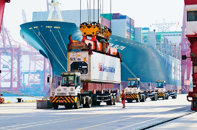 社會主義是干出來的,新時代是奮斗出來的?!拔逡弧奔倨冢S多勞動者堅守崗位,在辛勤工作中度過勞動者的節(jié)日。圖為2022年5月3日,在江蘇省連云港港集裝箱碼頭,工作人員為到港貨船卸運集裝箱。 新華社發(fā) 王健民/攝