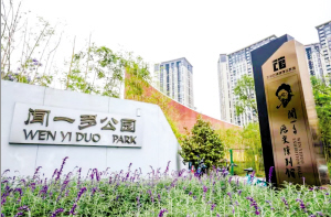走進(jìn)坐落于龍泉街道寶云社區(qū)的聞一多公園,遠(yuǎn)遠(yuǎn)就能看見擁有朱紅色流線型屋頂?shù)摹奥勔欢鄽v史陳列館共享空間”,成為掩映在綠植古建間的一抹亮色,與公園風(fēng)光融為一體。圖書區(qū)一面約4米高的“書墻”呈環(huán)狀將你包圍,百余個(gè)書架上陳列著浩如煙海的好書,書架下是三級(jí)長長的臺(tái)階,坐在臺(tái)階上,你可背靠“書山”感受濃濃學(xué)習(xí)氛圍。