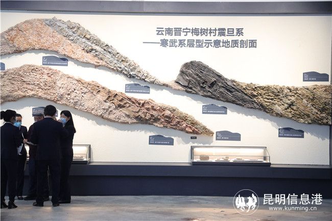 活動當天,眾多觀眾現(xiàn)場參觀了展覽,云南梅樹村剖面(省級)地質(zhì)自然保護區(qū)管理委員會張世山主任介紹,展覽中庭地面展示了滇池全貌,兩條地質(zhì)剖面分別從王家灣、梅樹村挖掘,展示了相應地質(zhì)變化,其中不同階段的生物化石、礦石等為地質(zhì)、考古等研究提供了不少參考。