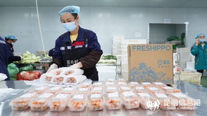 盒馬村蔬菜加工車間,產(chǎn)業(yè)工人正在給蔬菜打包