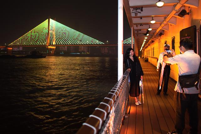 5月18日,游客在船上拍攝長(zhǎng)江邊的燈光秀。新華社記者 肖藝九 攝