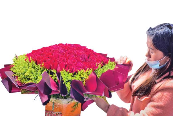 19日下午,官南大道的一家花店內(nèi),接單、剪枝、設計造型……店主陶女士十分忙碌?!澳壳敖拥搅恕?·20’鮮花訂單20余個,今天下午就有顧客將預訂的鮮花拿走了?!彼f。