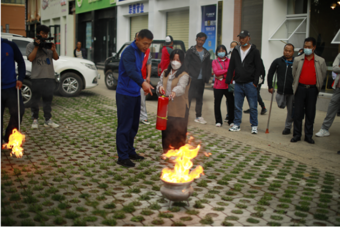 “使用滅火器之前先搖一搖,觀察風(fēng)向,噴射時(shí)保持2至5米的距離……”學(xué)習(xí)了解了防滅火知識(shí)后,大家來(lái)到比較寬敞的空地里,在玉龍縣消防救援大隊(duì)消防指戰(zhàn)員的實(shí)際操作示范下,學(xué)習(xí)滅火器材的使用方法,并進(jìn)行實(shí)際操作演練。