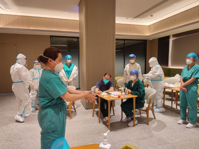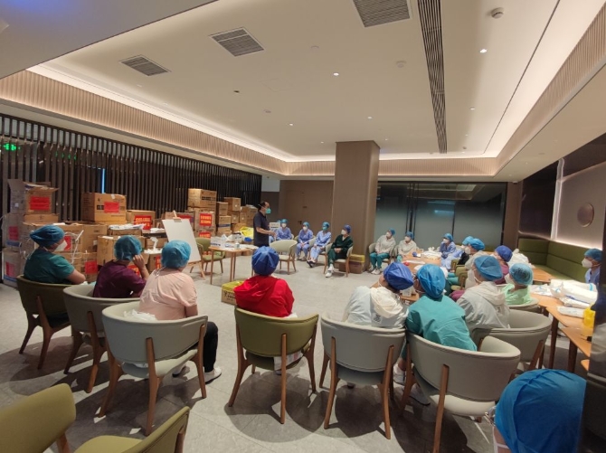 山西援滬醫(yī)療隊(duì)的隊(duì)員們正在培訓(xùn)院感防控。(受訪者提供)