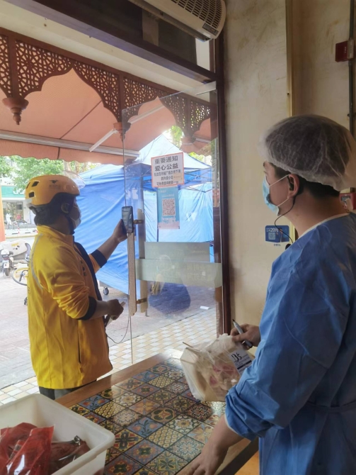 西域盛宴(上海古美路店)在恢復(fù)經(jīng)營(yíng)后,也堅(jiān)持將疫情防控放在首位。“我們?yōu)橥赓u騎手取餐設(shè)置了單獨(dú)的取餐臺(tái),他們每次過(guò)來(lái)都需要測(cè)量體溫,還要出示電子通行證和核酸碼,”該門店負(fù)責(zé)人王先生表示。