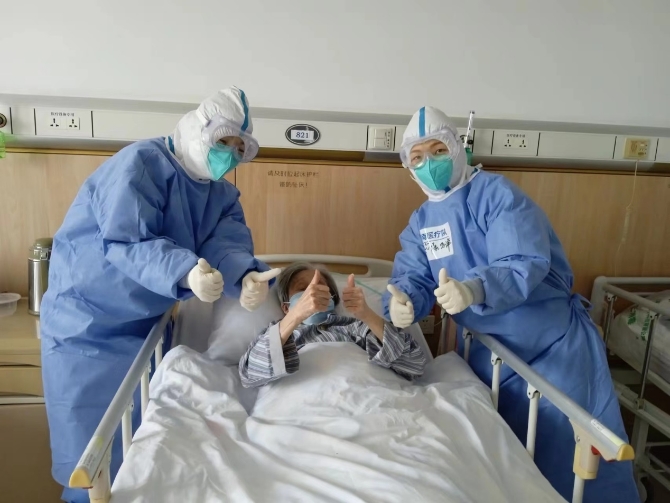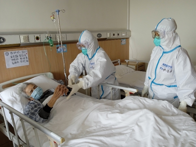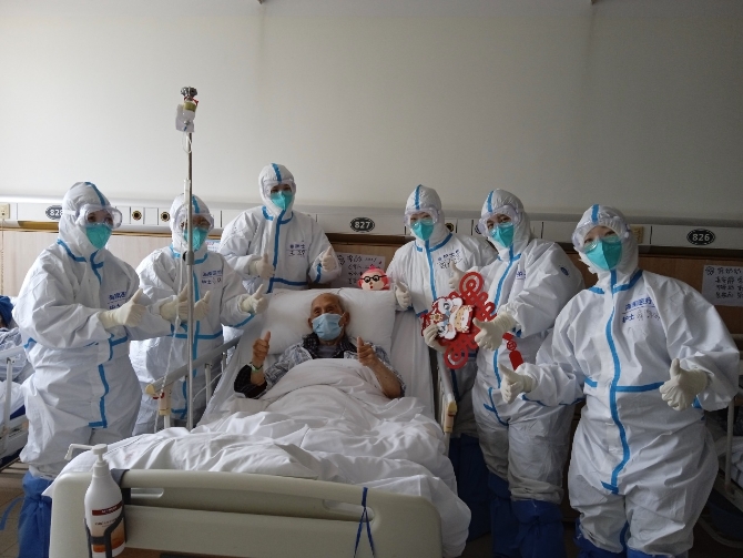 瑞金醫(yī)院北院里,102歲的患者經(jīng)過(guò)海南醫(yī)療隊(duì)醫(yī)護(hù)人員的護(hù)理,病情逐漸好轉(zhuǎn)