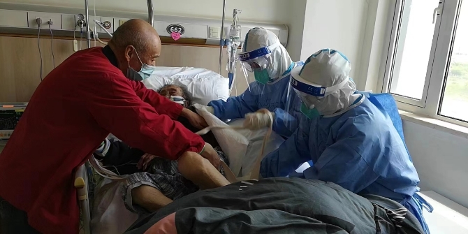 海南醫(yī)療隊(duì)隊(duì)員在瑞金醫(yī)院北院病房協(xié)助100歲高齡患者翻身