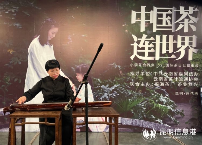 除了品茶、印章打卡,茶友雨中游園的興致極高,夏日的蓮花池庭院,三角梅、繡球花開得正好,池中花影與游魚相得益彰,茶友紛紛駐足觀賞,拍照留念。有省外茶友表示,想不到昆明藏著這樣一個(gè)古樸幽雅的庭院,太讓人驚艷了。活動(dòng)進(jìn)行到一半,古琴演奏家曹曉萌在庭院劇場內(nèi)即興撫琴,一首《流水》清遠(yuǎn)古拙,余音繚繞于室;更有塤者夏羽桐吹奏天籟,應(yīng)景茶會(huì)。