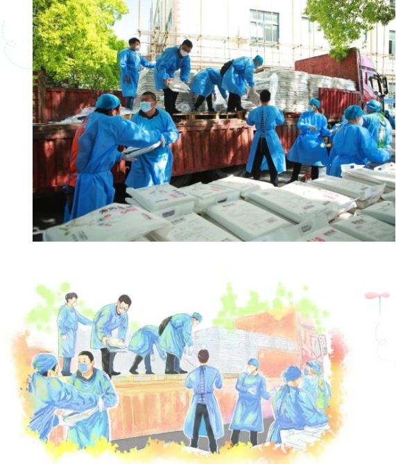 穿戴整齊的志愿者和工作人員,正齊心協(xié)力地把上百箱生活物資搬下車(chē),再經(jīng)過(guò)清點(diǎn)分類(lèi),按照區(qū)塊專(zhuān)人運(yùn)送,發(fā)放到每一位居民的手里。