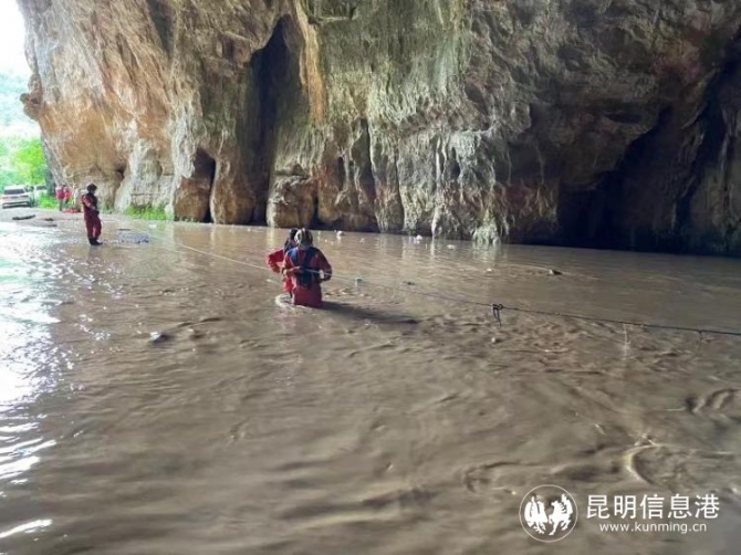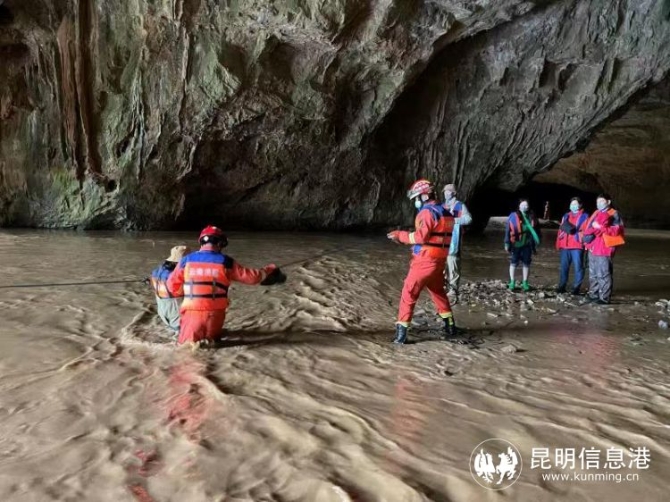 5月22日中午14時26分,昆明市宜良縣消防救援大隊接到報警稱:位于宜良縣九鄉(xiāng)鄉(xiāng)三角洞,6名人員組成的露營團,因下雨河水暴漲,被困于三角洞內(nèi),亟待救援。