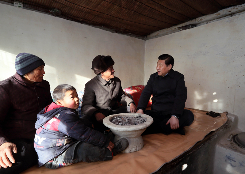 2012年12月29日至30日,中共中央總書記、中央軍委主席習近平在河北省阜平縣看望慰問困難群眾。這是習近平在龍泉關鎮(zhèn)駱駝灣村看望唐榮斌老人一家。新華社記者蘭紅光攝