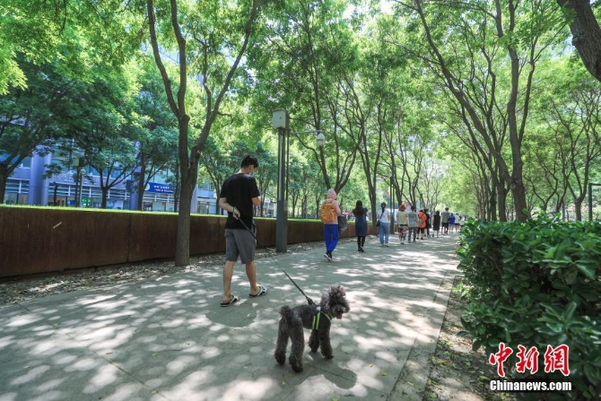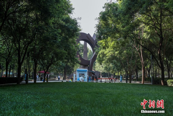 北京市朝陽區(qū)萬通中心附近,有一處綠蔭下的核酸檢測點。這里沒有其他核酸檢測點常見的遮陽棚和帳篷,高大的樹木形成天然的遮陽和降溫場所,民眾在林蔭道下排隊,醫(yī)護人員登記信息、采樣也都在樹蔭下完成。圖為5月21日拍攝的核酸檢測點。中新社記者 賈天勇 攝