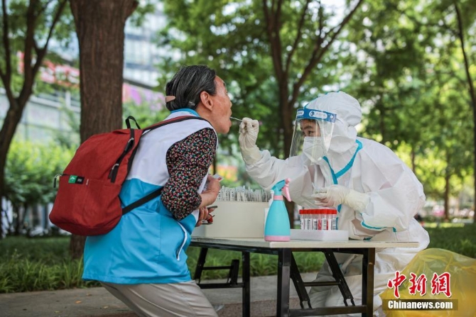 北京市朝陽區(qū)萬通中心附近,有一處綠蔭下的核酸檢測點。這里沒有其他核酸檢測點常見的遮陽棚和帳篷,高大的樹木形成天然的遮陽和降溫場所,民眾在林蔭道下排隊,醫(yī)護人員登記信息、采樣也都在樹蔭下完成。圖為5月21日,醫(yī)護人員陳俊華為市民做采樣。中新社記者 賈天勇 攝