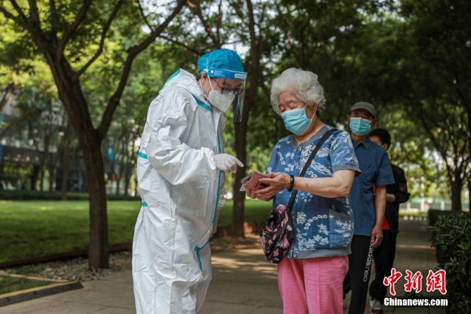 北京市朝陽區(qū)萬通中心附近,有一處綠蔭下的核酸檢測點。這里沒有其他核酸檢測點常見的遮陽棚和帳篷,高大的樹木形成天然的遮陽和降溫場所,民眾在林蔭道下排隊,醫(yī)護人員登記信息、采樣也都在樹蔭下完成。圖為5月20日,醫(yī)護人員劉雅君查驗排隊市民的北京健康寶狀態(tài)。中新社記者 賈天勇 攝