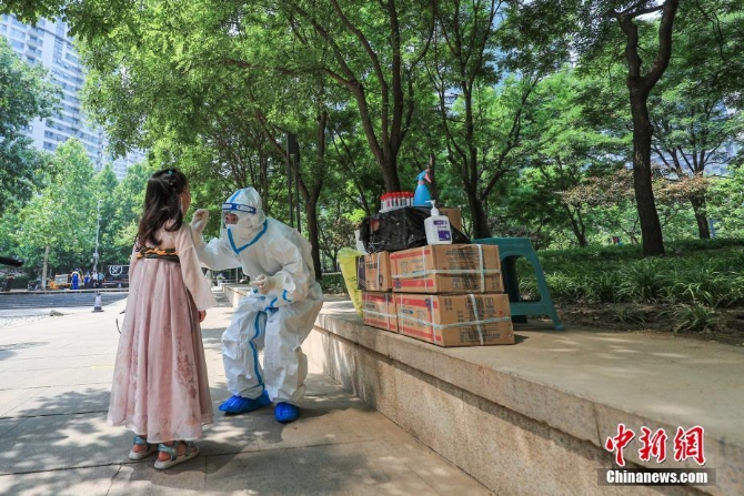 北京市朝陽區(qū)萬通中心附近,有一處綠蔭下的核酸檢測點。這里沒有其他核酸檢測點常見的遮陽棚和帳篷,高大的樹木形成天然的遮陽和降溫場所,民眾在林蔭道下排隊,醫(yī)護人員登記信息、采樣也都在樹蔭下完成。圖為5月19日,醫(yī)護人員在樹下為小朋友做核酸采樣。中新社記者 賈天勇 攝