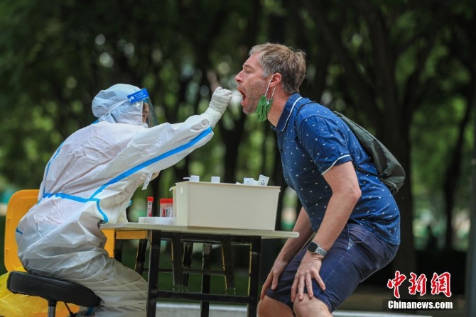 北京市朝陽區(qū)萬通中心附近,有一處綠蔭下的核酸檢測點。這里沒有其他核酸檢測點常見的遮陽棚和帳篷,高大的樹木形成天然的遮陽和降溫場所,民眾在林蔭道下排隊,醫(yī)護人員登記信息、采樣也都在樹蔭下完成。圖為5月19日,醫(yī)護人員陳俊華為一名外國人做采樣。中新社記者 賈天勇 攝