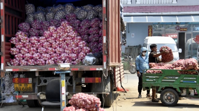 5月20日,商家在北京新發(fā)地市場(chǎng)搬運(yùn)大蒜。(新華社記者 李欣 攝)