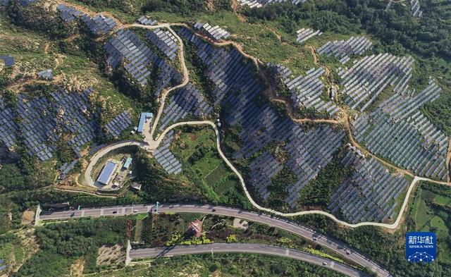 通往西柏坡的高速公路和西柏坡鎮(zhèn)一處荒山上的光伏發(fā)電場(2019年8月16日攝,無人機照片)。新華社記者 楊世堯 攝
