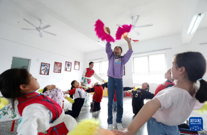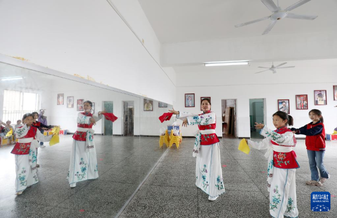 5月25日,在湖南省資興市鯉魚江完小,戲曲老師指導(dǎo)學(xué)生學(xué)習(xí)戲曲基本動作。新華社發(fā)(李科 攝)