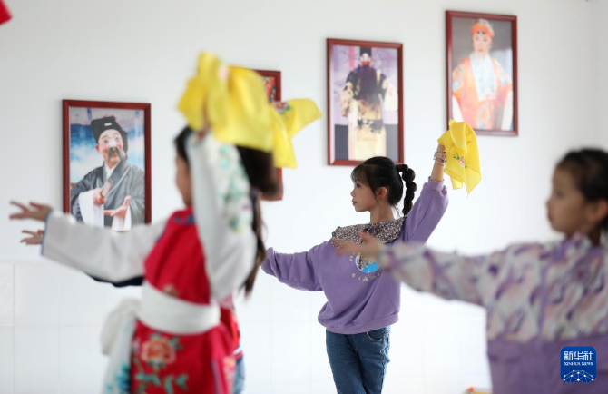 5月25日,在湖南省資興市鯉魚江完小,學(xué)生練習(xí)戲曲基本動作。新華社發(fā)(李科 攝)